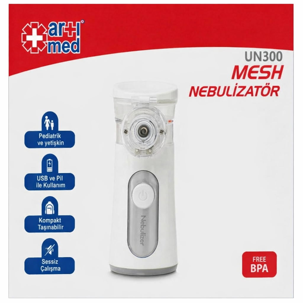 Artimed Mesh Taşınabilir Nebulizatör UN 300. Gürültüsüz çalışması ve taşınabilir yapısıyla her yerde konforlu solunum terapisi sunan yeni nesil cihaz; Mesh teknolojisiyle yüksek verimli buhar üretimi, hafif tasarımı ve hem pil hem USB ile çalışabilme özgürlüğüyle bebeklerden yetişkinlere tüm aile için ideal profesyonel nebulizatör.