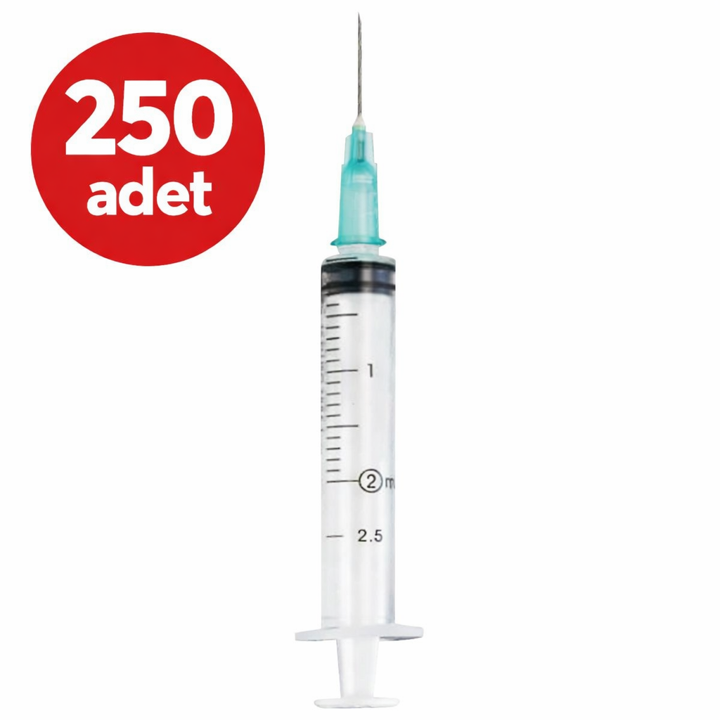 Genject Enjektör 2,5 cc 3 Parça Yeşil - 250 Adet. Hastaneler ve klinikler için özel olarak paketlenmiş 250'li avantajlı koli; kas içi enjeksiyonlar ve sıvı çekimi için ideal 21G (yeşil) iğne ucu, 2,5 cc spesifik ara hacmi ve sızdırmaz 3 parçalı kauçuk contasıyla pürüzsüz ilaç transferi sağlayan steril, tek kullanımlık profesyonel medikal sarf malzemesi.